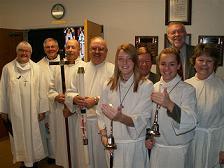 All Saints, Nov. 2006: l to r: Pastor Avis, BIshop Rich Omland, deacons Tim Miller and Alan Michaels, acolytes Bailey Gibbs and Katie Turner, deacon Maureen Lundman. In the back: Terry Oliver and Jim Magelssen, sons of the congregation in ministry |